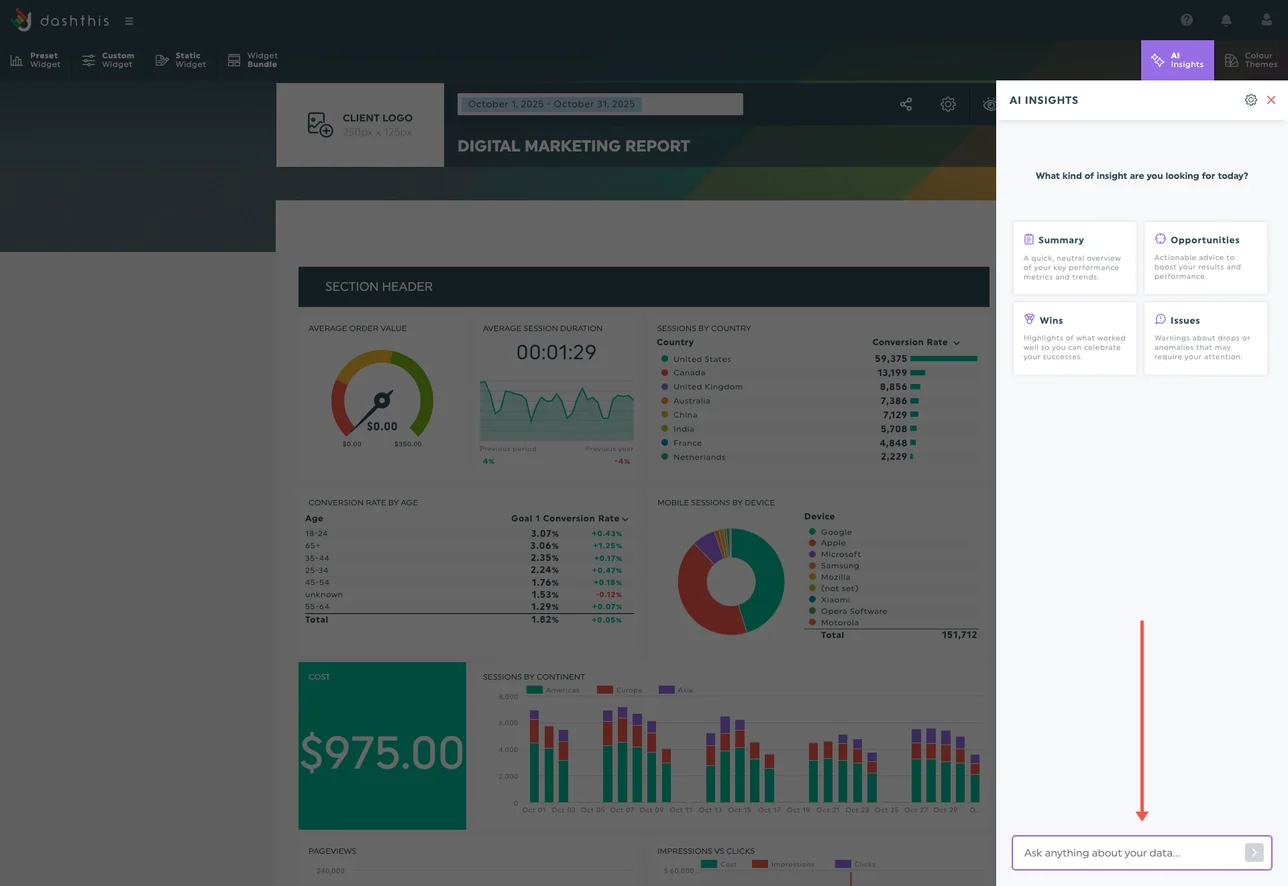 Bei DashThis war es schon immer unser Ziel, Marketingberichte einfach und aufschlussreich zu gestalten. Ihr habt uns gesagt, dass unsere kostenlosen KI-Einblicke zwar super für schnelle Übersichten sind, ihr aber tiefer gehen, individuelle Fragen stellen, geschäftliche Zusammenhänge hinzufügen und auf eure Ziele zugeschnittene Einblicke erhalten möchtet.