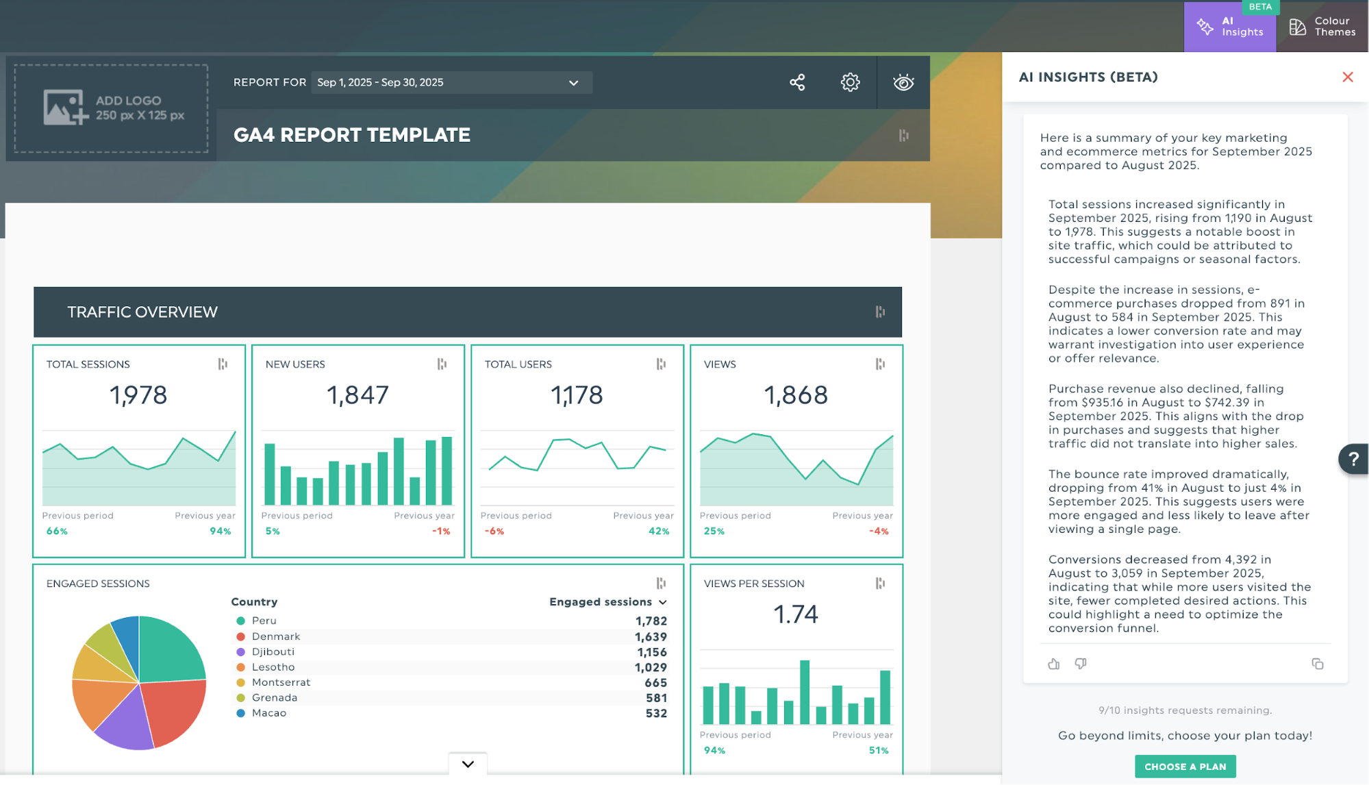 Nachdem du dein dashboard erstellt hast, kannst du die KI-Einsichten von DashThis nutzen, um wichtige Muster zu erkennen und deine Analyse in Gang zu setzen. Du kannst sie zum Beispiel nutzen, um einen schnellen Überblick über deine Daten zu bekommen oder um Gewinne und Probleme in den Daten hervorzuheben, die du weiter untersuchen kannst. Schauen wir uns an, wie das in der Praxis mit Google Analytics 4-Daten funktioniert.