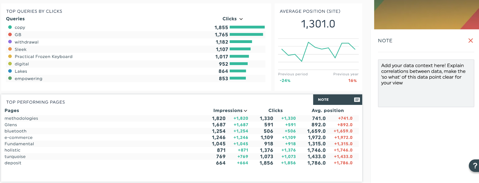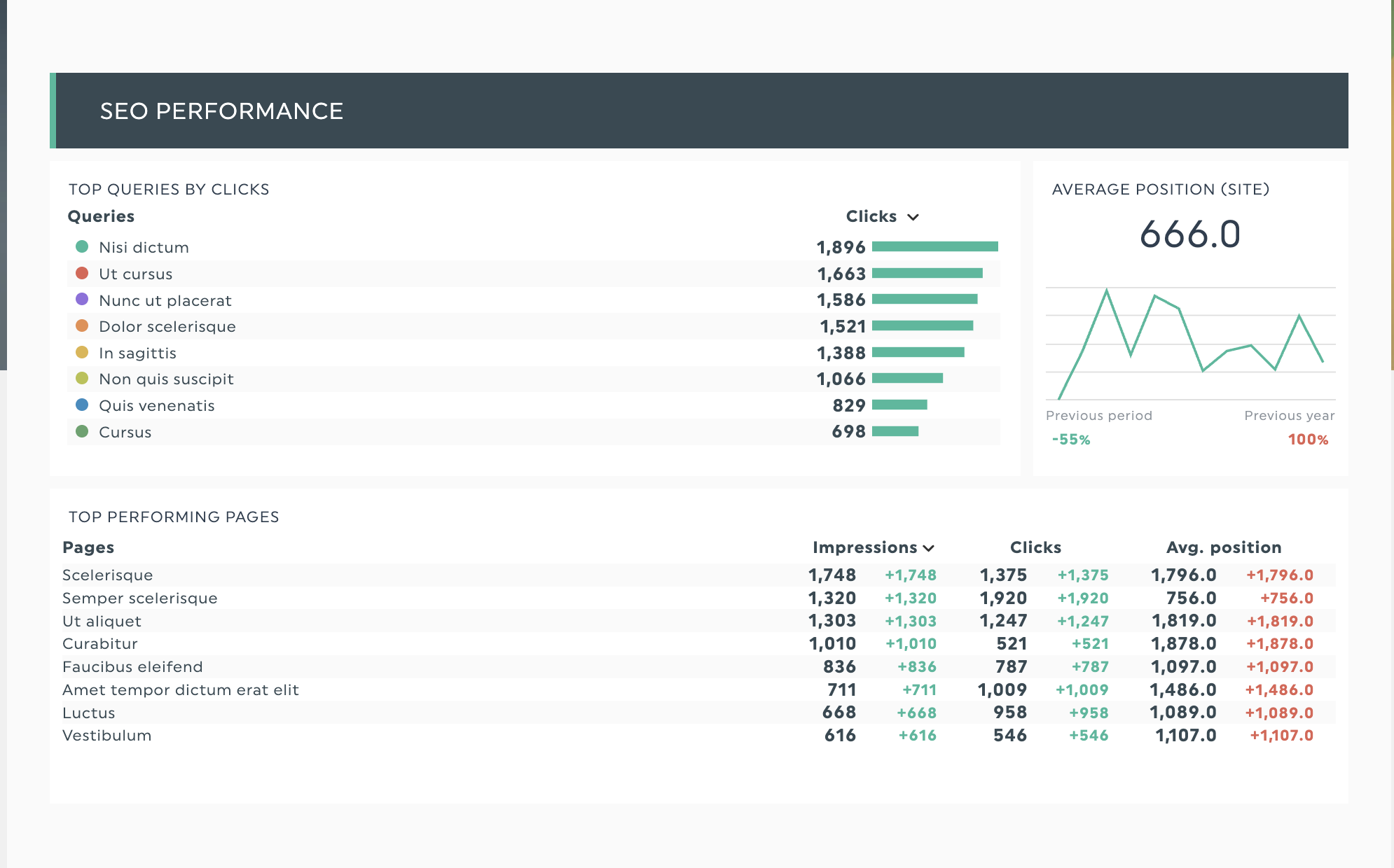 SEO-Datenpräsentationen haben oft viele Zahlen und verschiedene Metriken. Angenommen, du willst deine besten Landingpages als Top-Kandidaten für Maßnahmen zur Verbesserung der Seitengeschwindigkeit hervorheben. Unsere SEO-Berichtsvorlage kann die Entwicklung im Monatsvergleich mit einer kleinen Tabelle mit der durchschnittlichen Position und den Klicks zeigen.