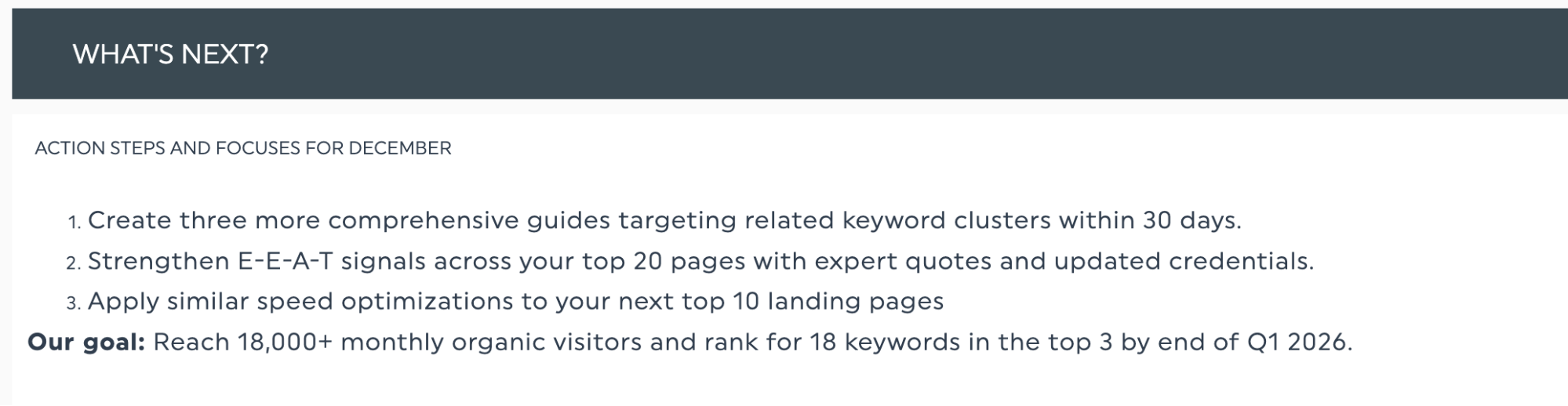 Ziel: Bis Ende des ersten Quartals 2026 mehr als 18.000 organische Besucher pro Monat erreichen und bei 18 Keywords unter den Top 3 ranken.
