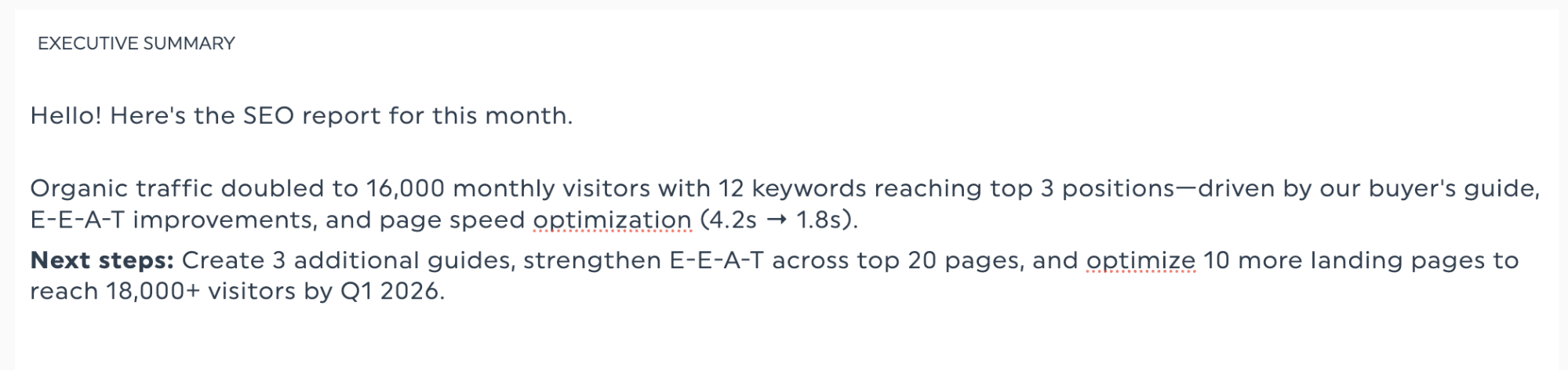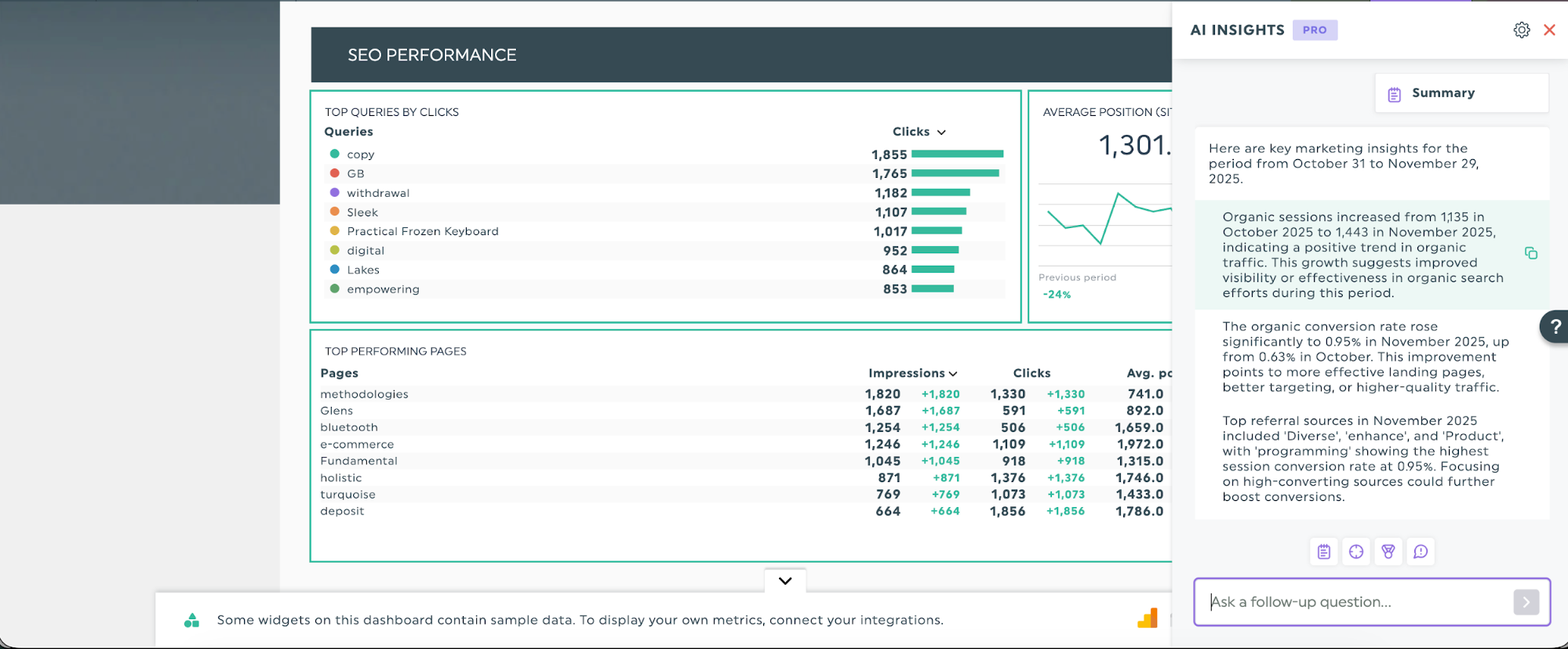 KI kann dir bei der Analyse helfen, indem sie Muster in deinen historischen Daten findet, die du vielleicht übersehen würdest. Die KI von DashThis könnte zeigen, dass eine schnellere Seitengeschwindigkeit mit niedrigeren Absprungraten und höheren Rankings zusammenhängt oder dass Inhaltsaktualisierungen die Positionen verwandter Keywords stetig verbessern, sodass du schneller erkennen kannst, was funktioniert.