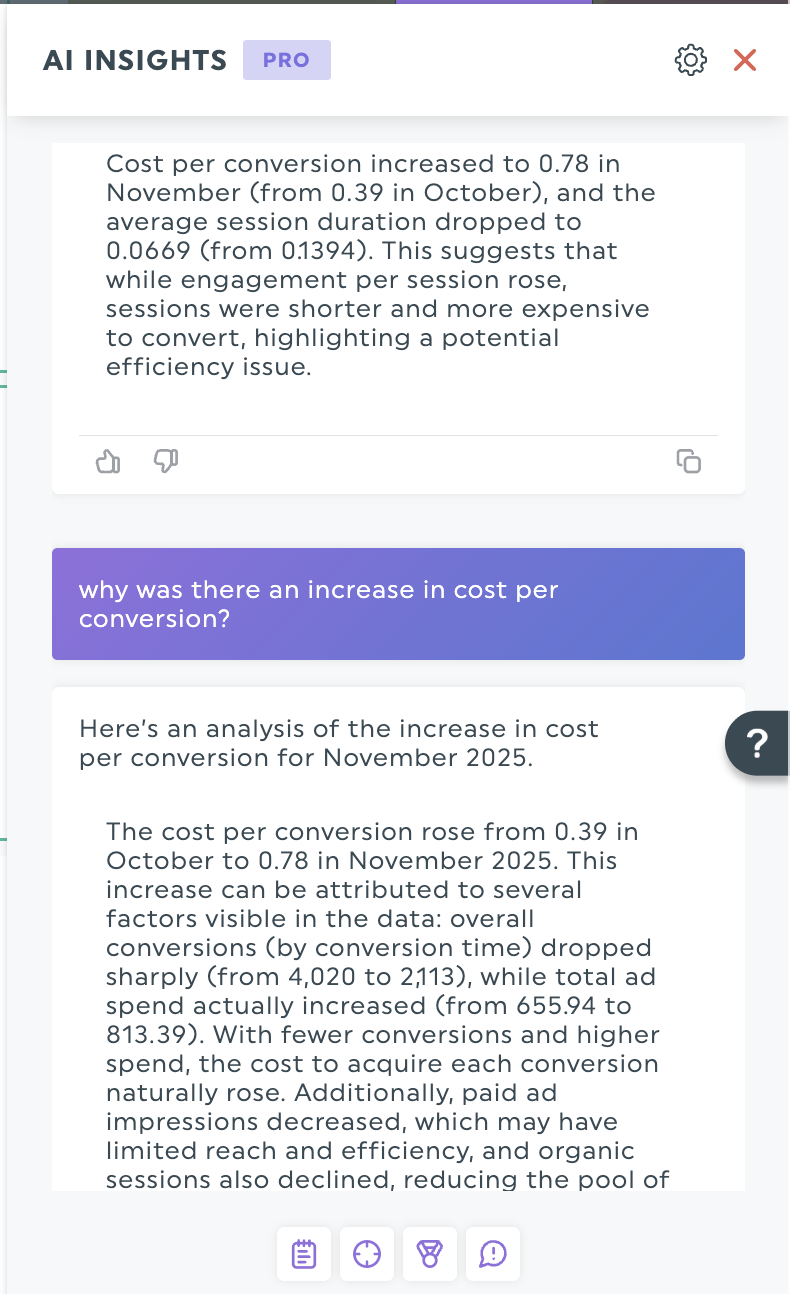 Wenn diese hochkarätigen Einblicke neue Fragen aufwerfen, kannst du mit AI Insights Pro mit der KI chatten, um Details zu erkunden. Wenn die Zusammenfassung einen Anstieg der Kosten pro Conversion zeigt, kannst du die KI auffordern, den Trend genauer zu analysieren.
