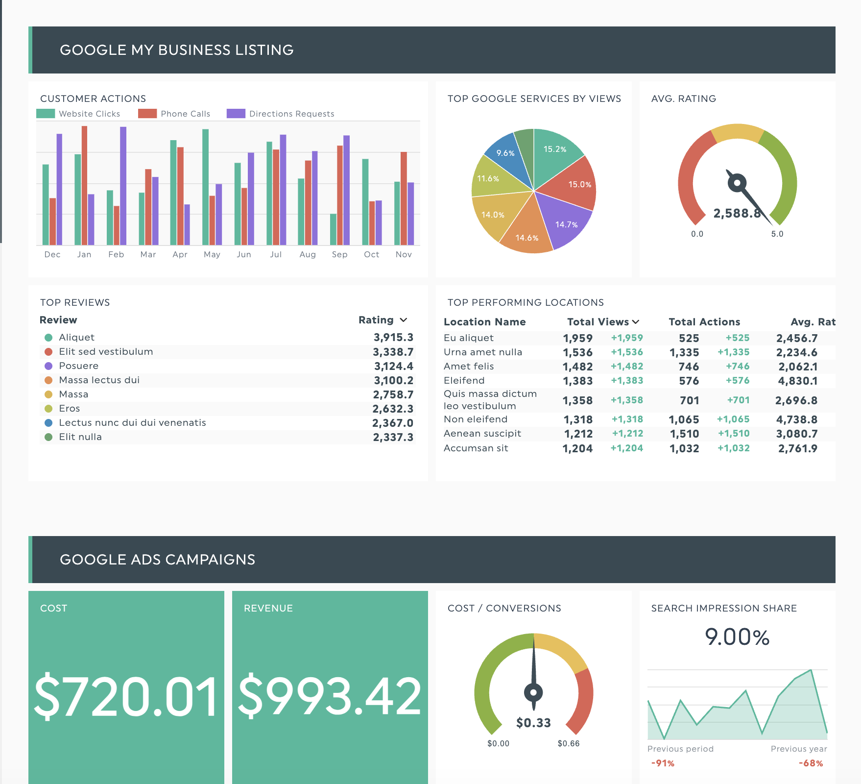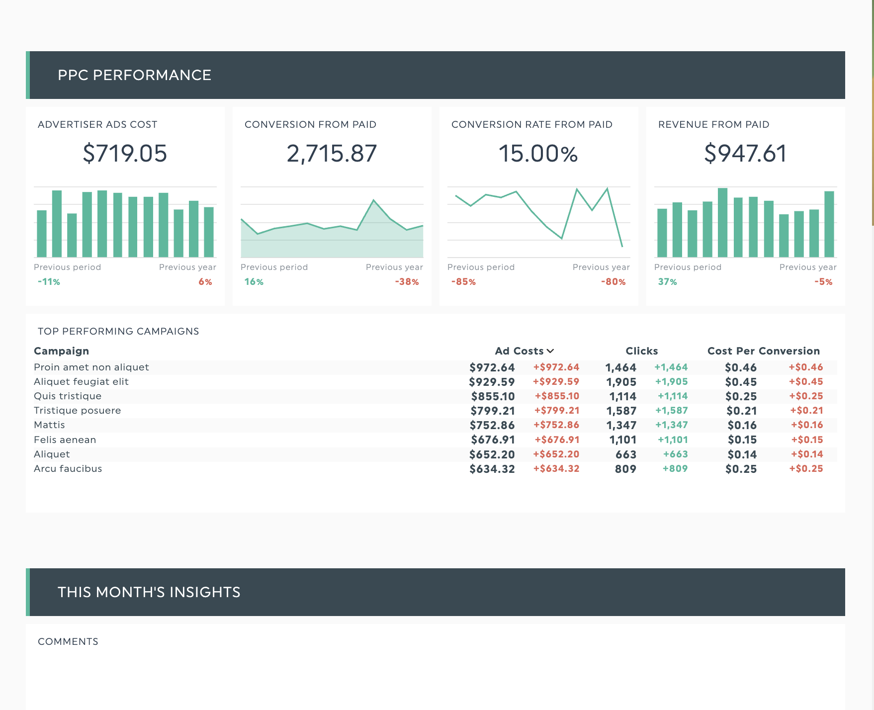 DashThis hat über 50 vorgefertigte Vorlagen, die Marketingberichte und Datenanalysen automatisch strukturieren, sodass du dich auf die Bereitstellung von Erkenntnissen konzentrieren kannst, anstatt dich mit der Formatierung zu beschäftigen. Wir haben Vorschläge dazu gemacht, welche Datenpunkte in diesen Vorlagen hervorgehoben und besonders hervorgehoben werden sollten.