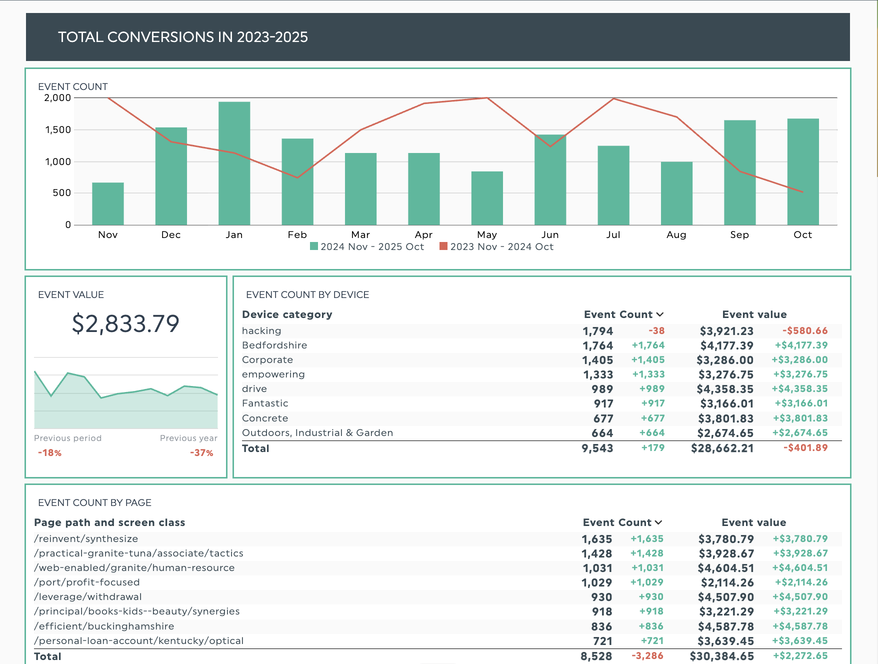 Angenommen, du musst deine Gesamtkonversionen über das ganze Jahr vergleichen, um Trends oder Muster zu erkennen. Ein einfaches Balkendiagramm und ein Liniendiagramm zeigen dir, wie sich die Trends über die beiden Jahre verändert haben, sodass du schnell die Spitzen- und Flautezeiten für weitere Diskussionen herausfinden kannst.