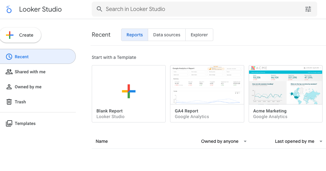 Für Marketingleute, die schon im Google-Ökosystem arbeiten, ist Looker Studio ein klarer Einstiegspunkt. Es lässt sich direkt mit Google Analytics 4, Google Ads, Google Search Console, BigQuery und Google Sheets verbinden, sodass du alle deine Google-Kanaldaten ohne Connectors von Drittanbietern in einem einzigen Bericht zusammenfassen kannst. Der Drag-and-Drop-Berichtgenerator ist auch für Leute ohne technische Kenntnisse einfach zu bedienen, und die Vorlagengalerie bietet dir einen guten Start für die gängigsten Berichtsszenarien.
