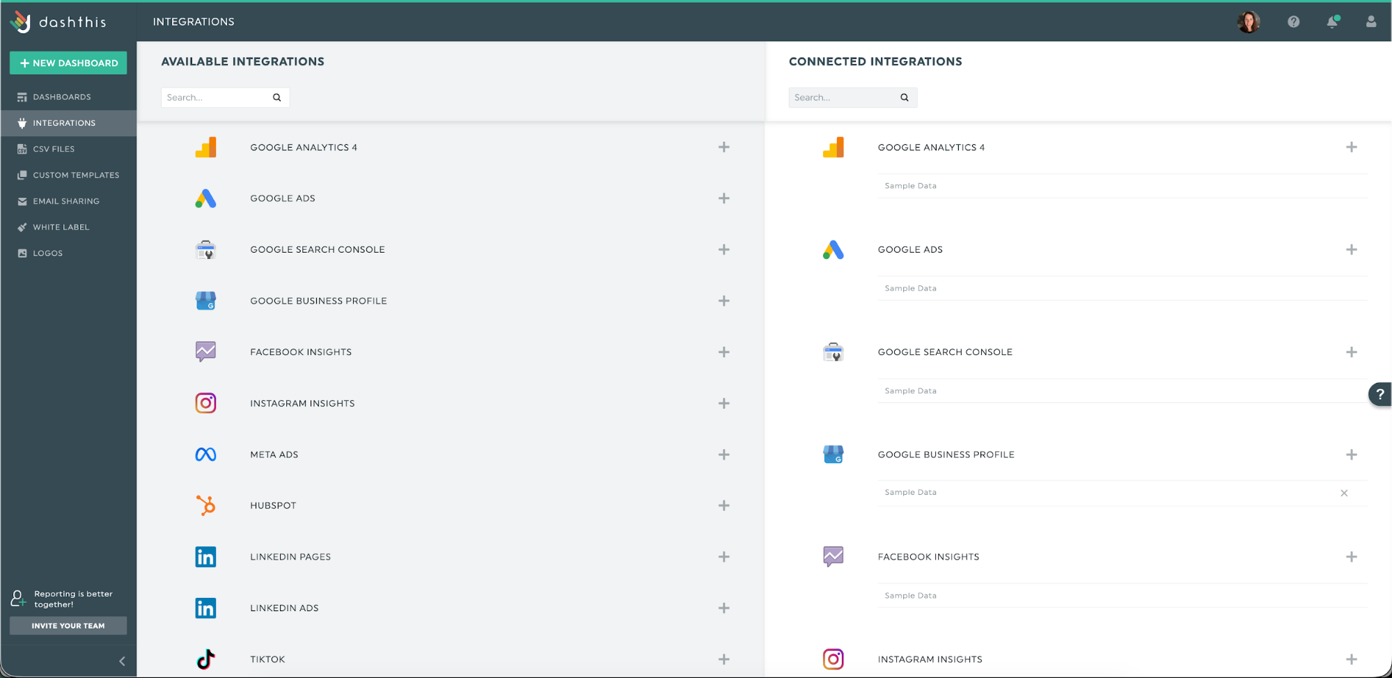 Oder du lässt DashThis die Routinearbeit erledigen. Verbinde deine Plattformen einmalig, und deine Daten fließen automatisch in präsentationsfertige dashboards. Keine endlosen Export-, Kopier- und Einfügevorgänge mehr.