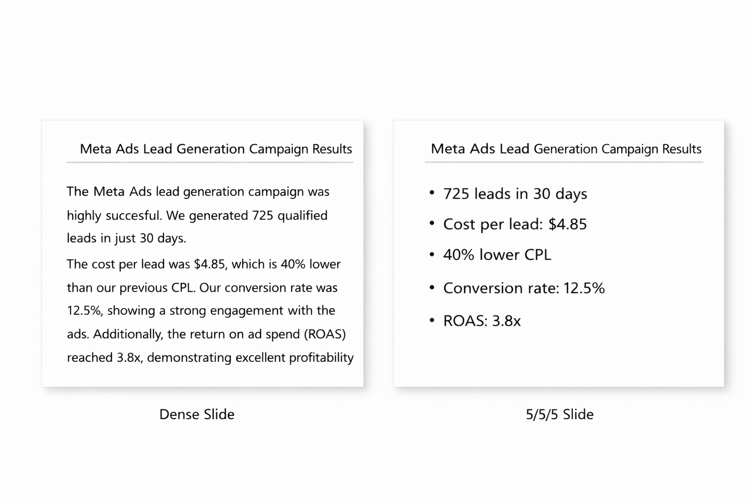 Jede Folie sollte eine Frage beantworten. Für die Performance von Facebook-Anzeigen solltest du eine Folie für den ROAS und eine andere für die Kosten pro Akquisition verwenden, anstatt alles auf eine einzige Folie zu packen.