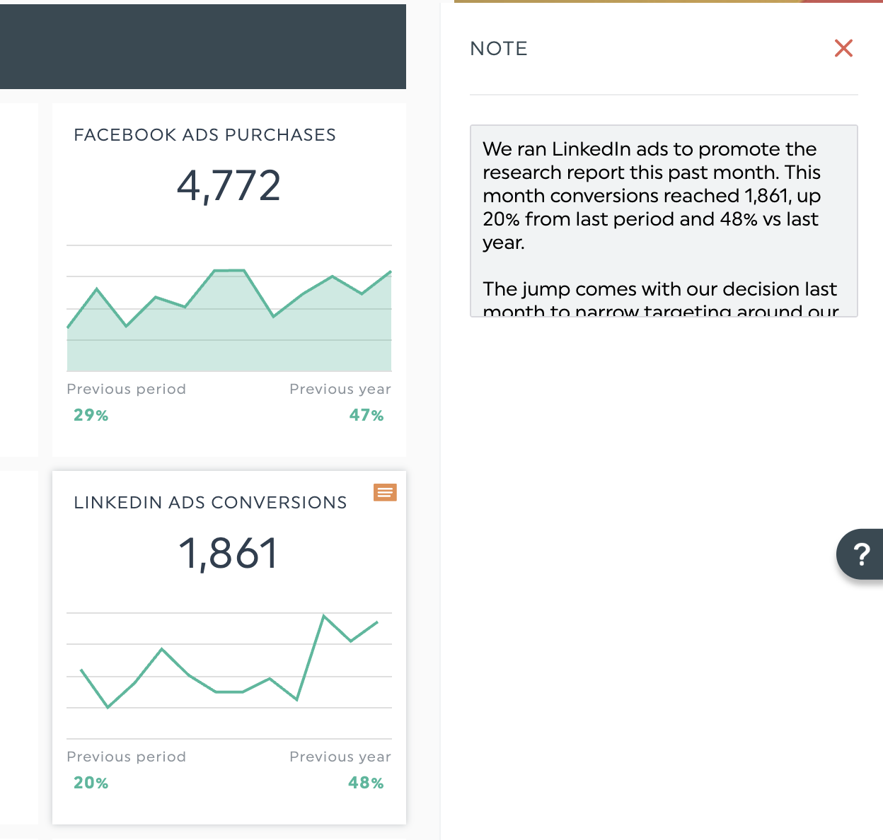 Das Hinzufügen von Erklärungen kann einen Bericht unübersichtlich machen. Mit den Notizen und Kommentaren von DashThis kannst du bestimmten Kennzahlen oder Abschnitten eines Berichts einen Kontext hinzufügen, ohne dass es zu visuellen Störungen kommt. So kannst du z. B. einen sprunghaften Anstieg der Konversionsrate in einem Kommentar wie diesem erklären.