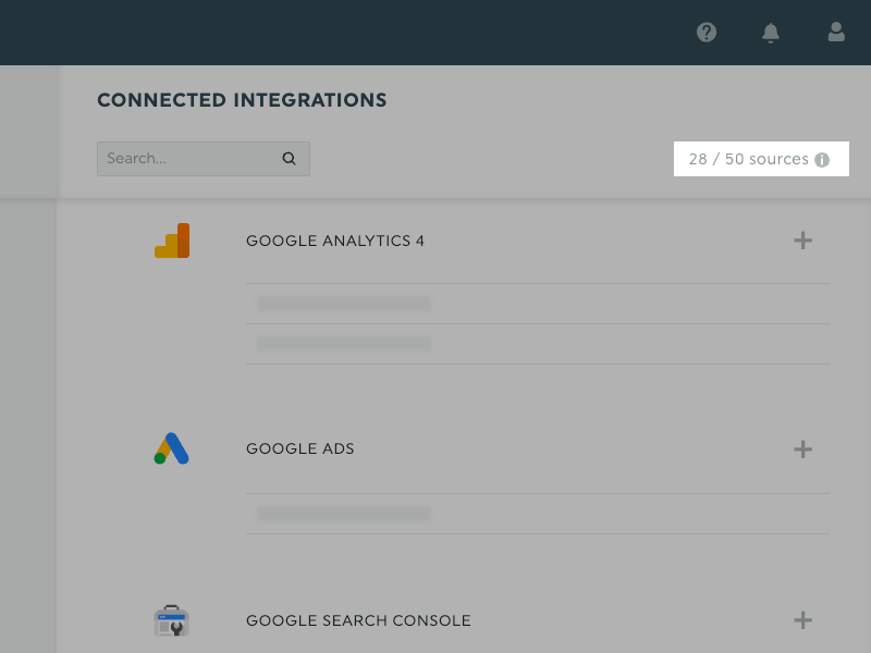 Du kannst an zwei Stellen in deinem DashThis-Konto sehen, wie viele Quellen du gerade nutzt. An beiden Stellen wird angezeigt, wie viele Quellen du im Vergleich zu den in deinem Plan enthaltenen Quellen nutzt.