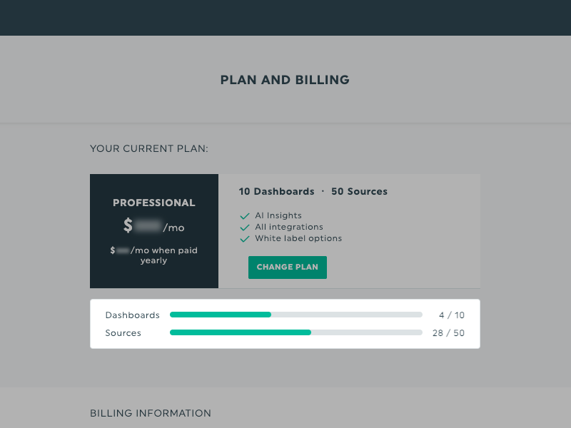 Dieses Update bringt eine quellbasierte Preisgestaltung mit sich, was bedeutet, dass die Tarife jetzt sowohl die von dir verbundenen Datenquellen als auch die dashboards berücksichtigen.